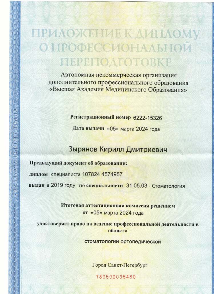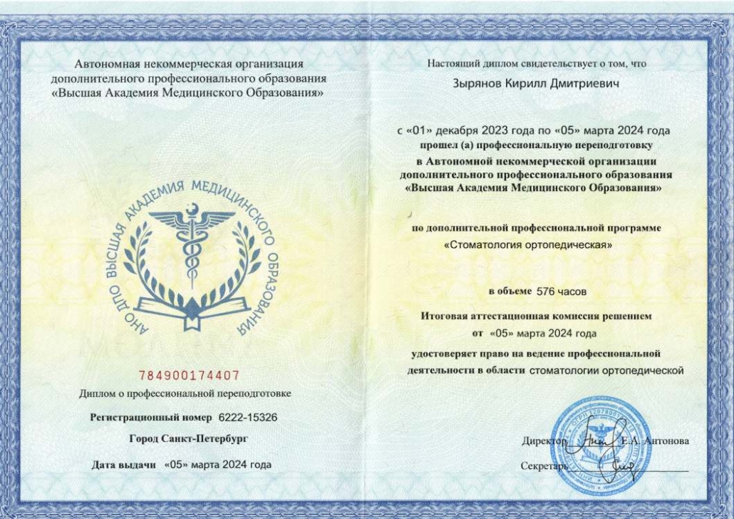ПСПбГУ им акад. И.П.Павлова по специальности «Стоматология»
